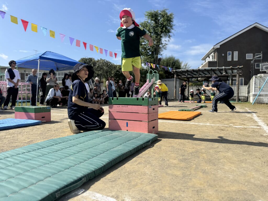 2歳児:真剣な表情で両手を広げ平均台を渡って巧技台からジャンプ。一人一人がとても
