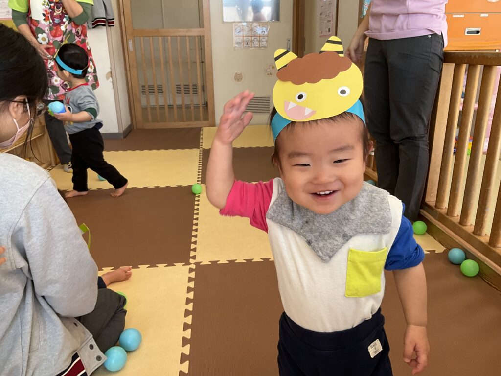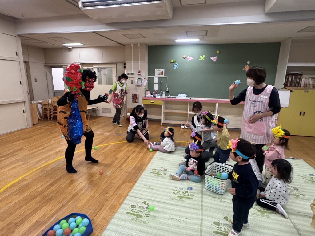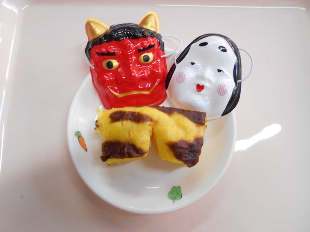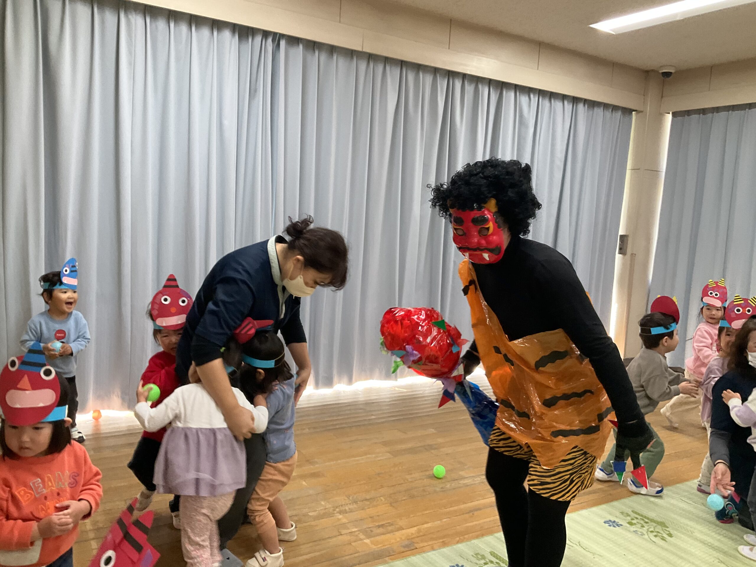 集いでは、節分の由来を聞いたり、豆まきの歌をうったり製作した鬼のお面の紹介もしました。かわいい鬼に変身した子ども達でしたが、鬼が登場すると「鬼は外、福は内」と言いながら豆に見立てたボールを投げ大奮闘。鬼に驚いて涙を見せる子もいました。給食やおやつも可愛い鬼をイメージしたメニューで美味しく頂き、心も体も幸せに。