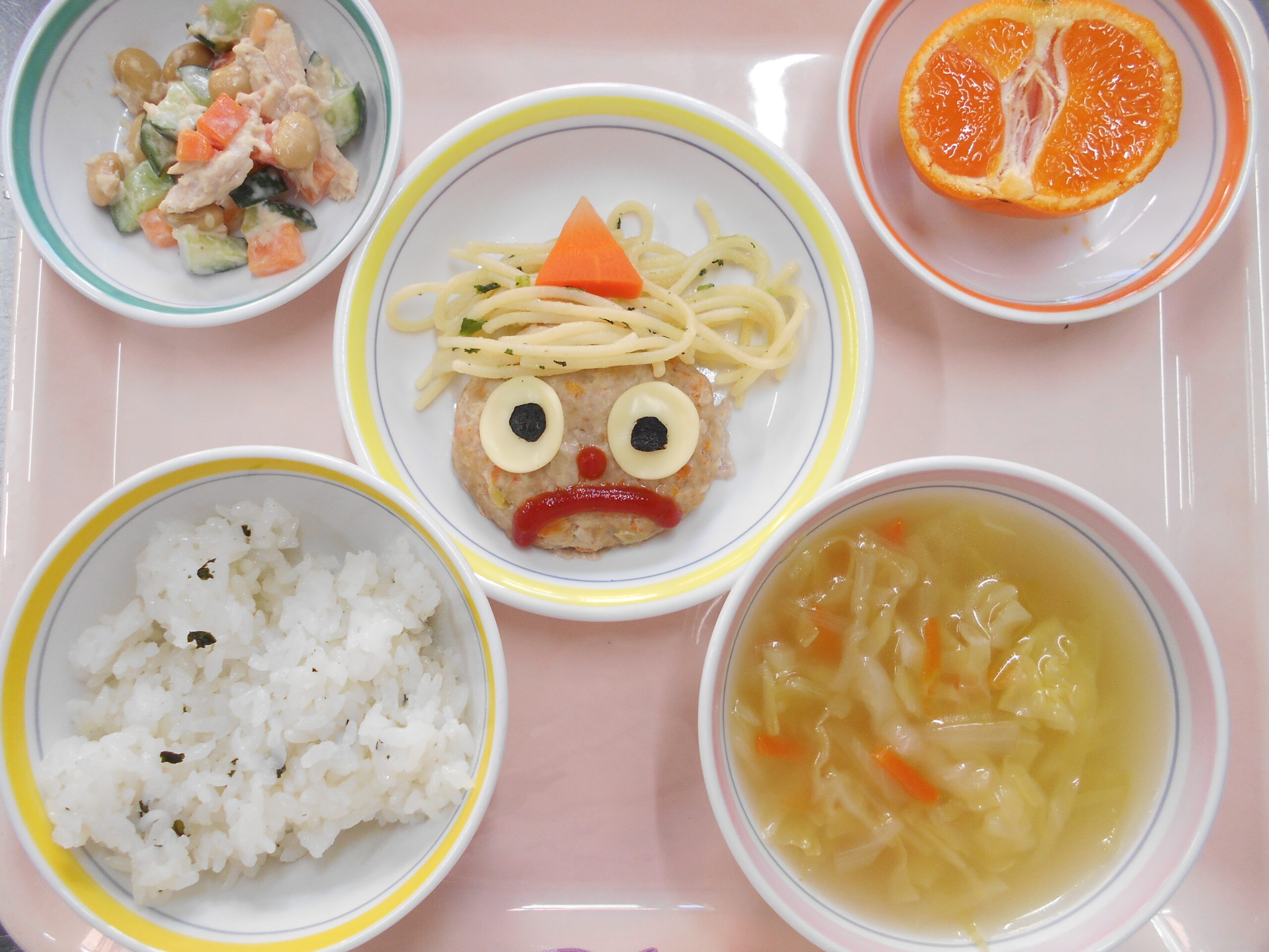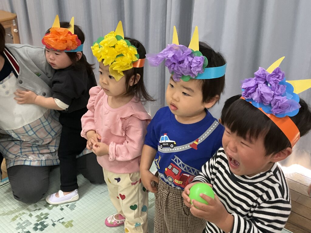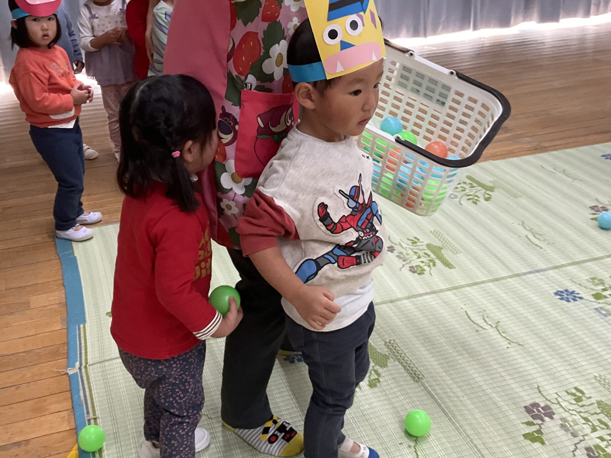 集いでは、節分の由来を聞いたり、豆まきの歌をうったり製作した鬼のお面の紹介もしました。かわいい鬼に変身した子ども達でしたが、鬼が登場すると「鬼は外、福は内」と言いながら豆に見立てたボールを投げ大奮闘。鬼に驚いて涙を見せる子もいました。給食やおやつも可愛い鬼をイメージしたメニューで美味しく頂き、心も体も幸せに。