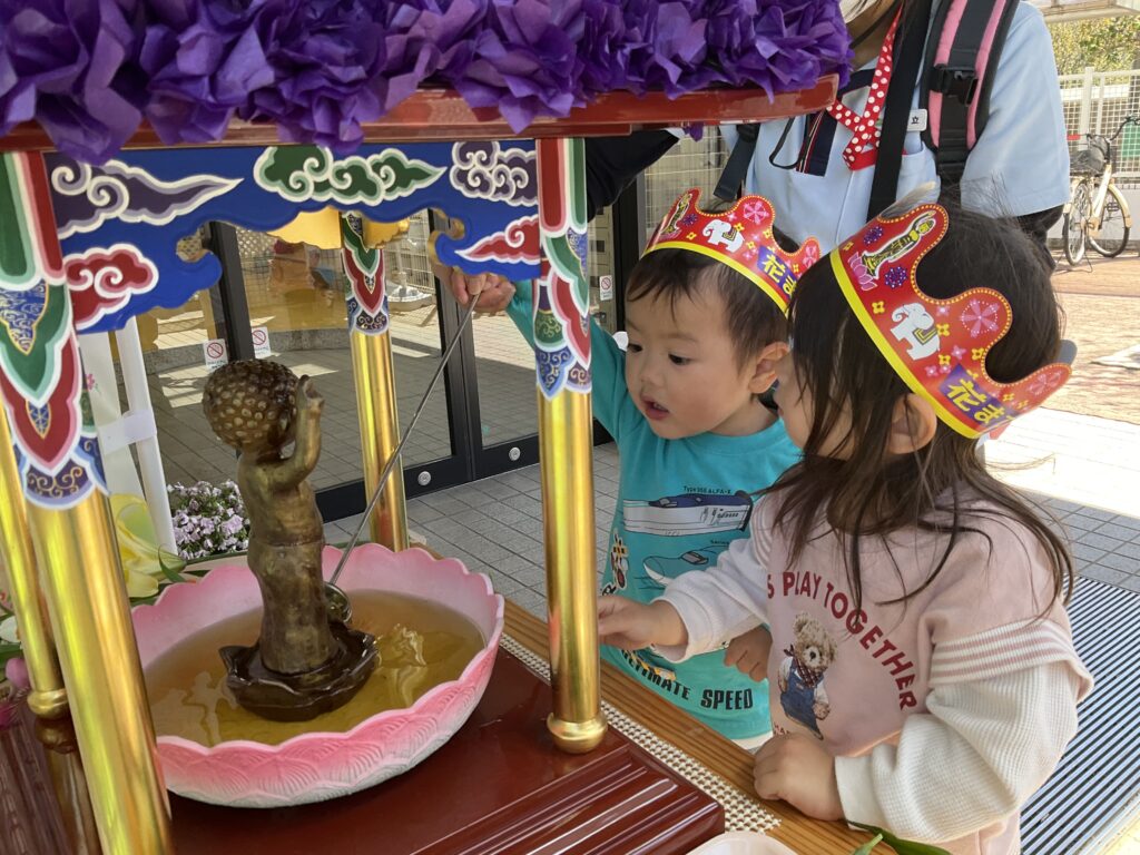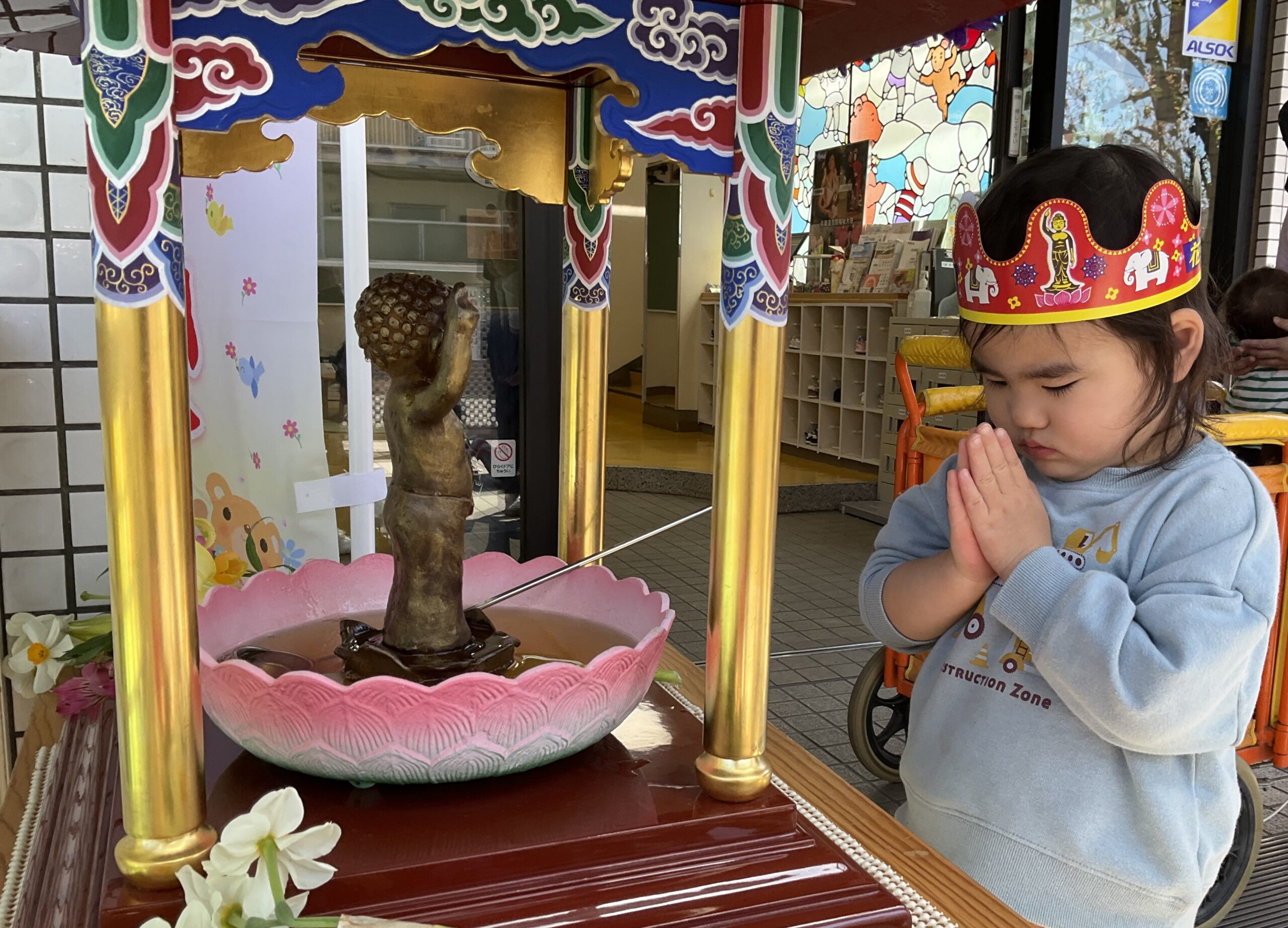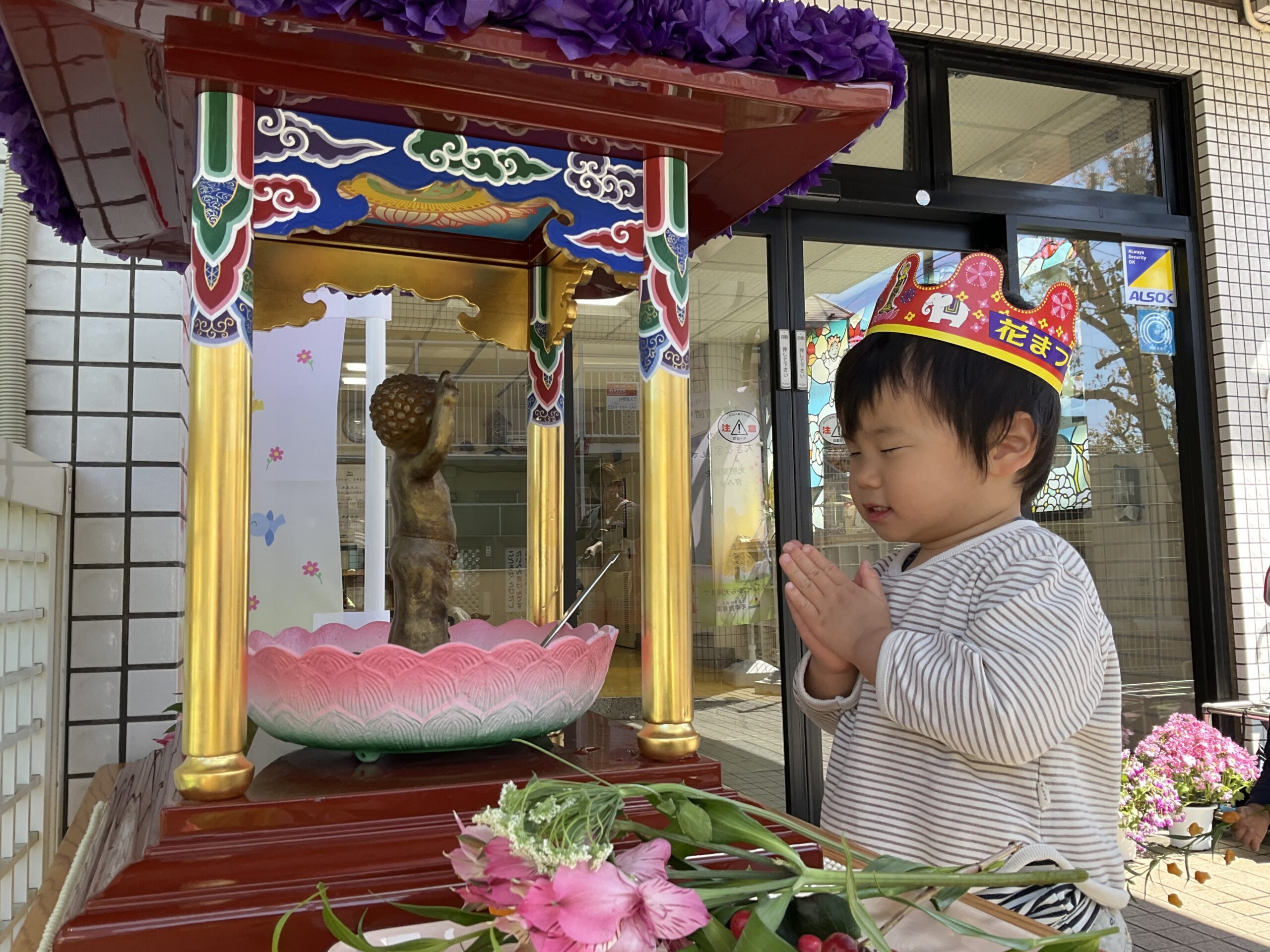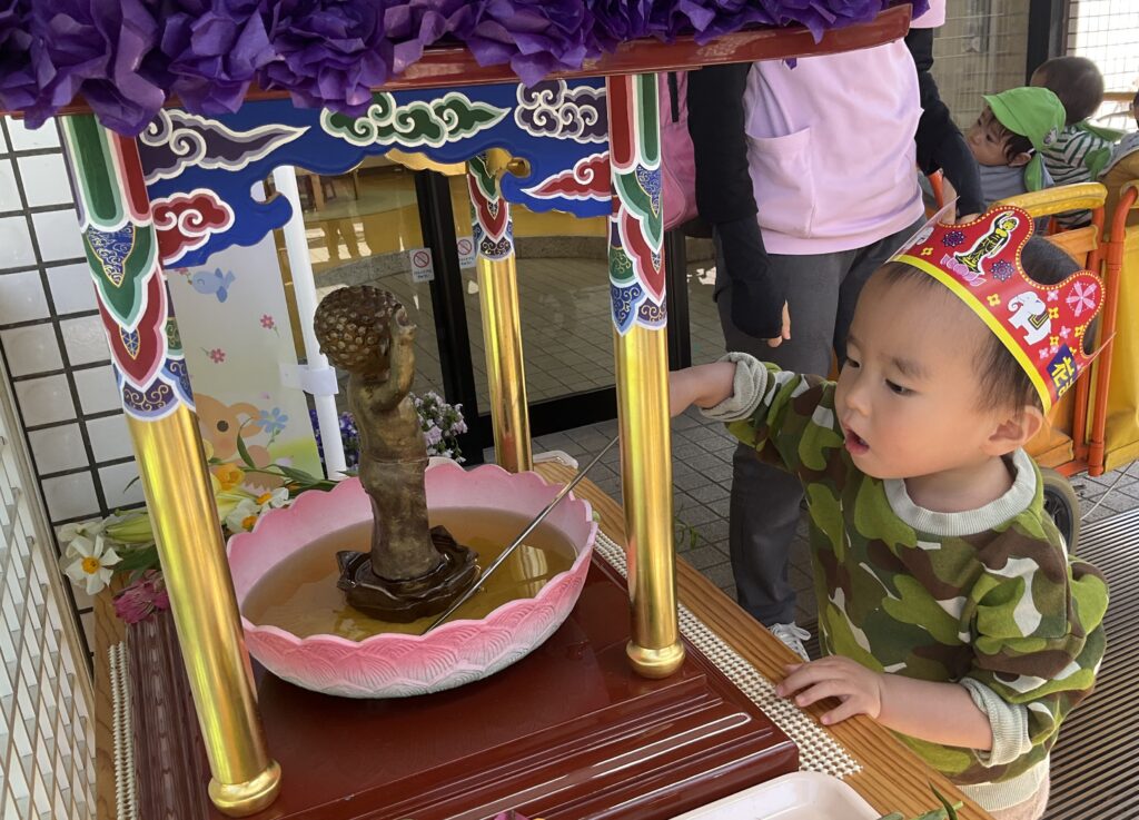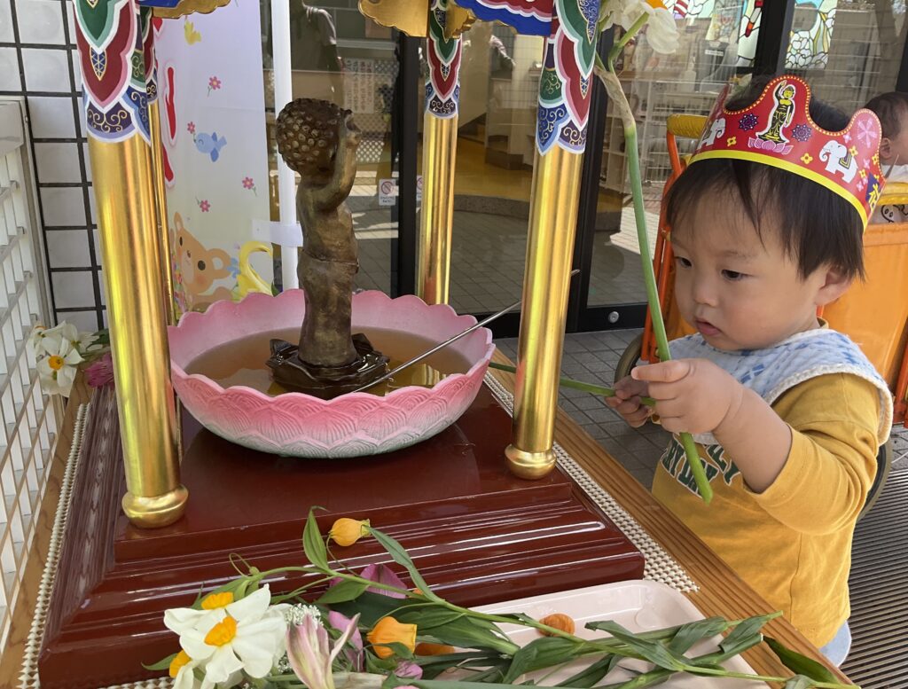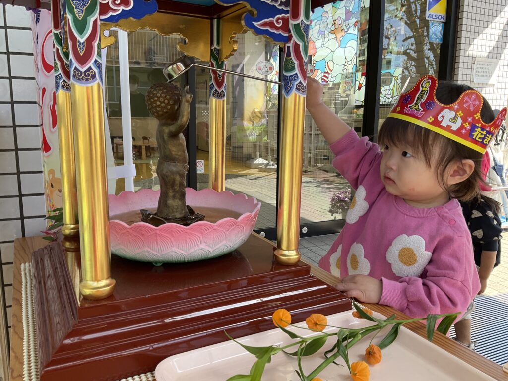 今日、4月8日は花まつりです。 花まつりは、お釈迦様の誕生日をお祝いする日です。 子ども達は、冠をかぶりお釈迦様に甘茶をかけて手を合わせ『健康で、良い子になりますように』とお祈りしました。