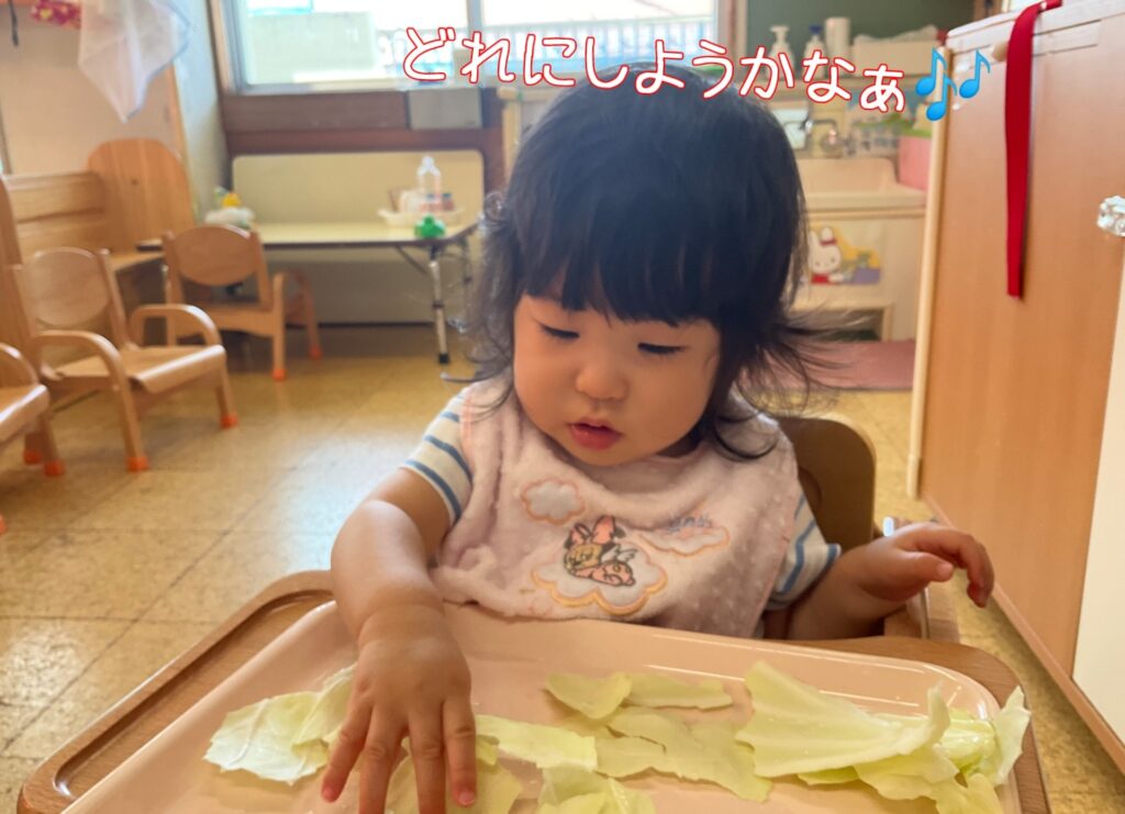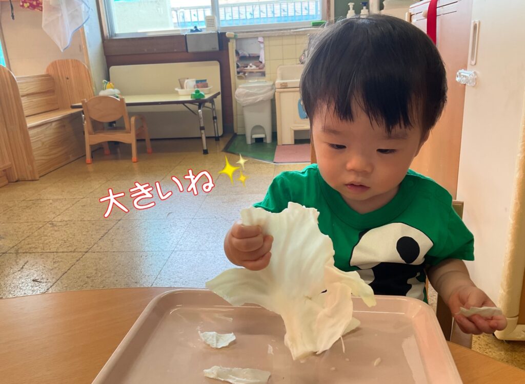 0歳児の子ども達がキャベツちぎりに挑戦。思わず
