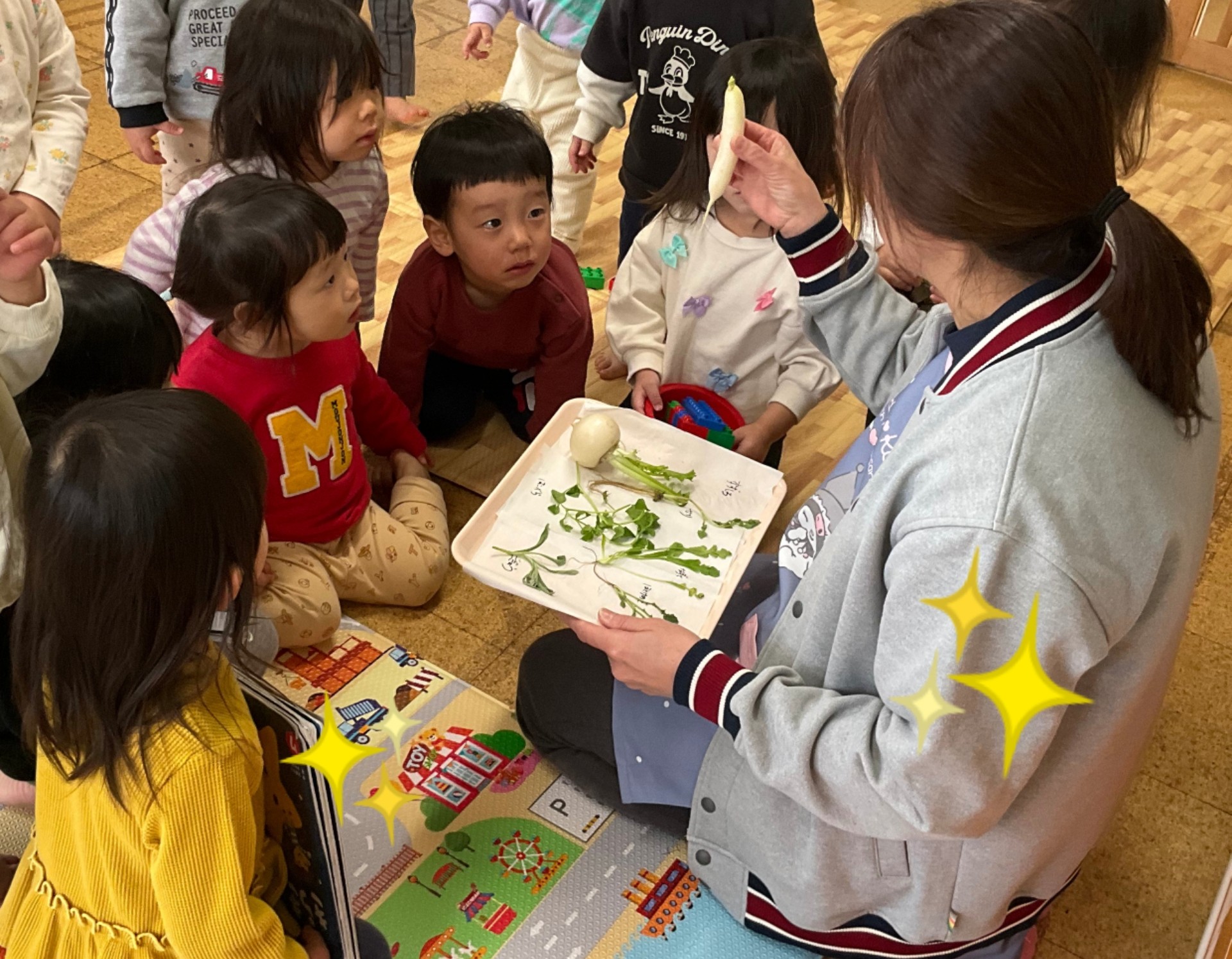 七草粥の食材を見たり触ったりしながら子ども達に説明
