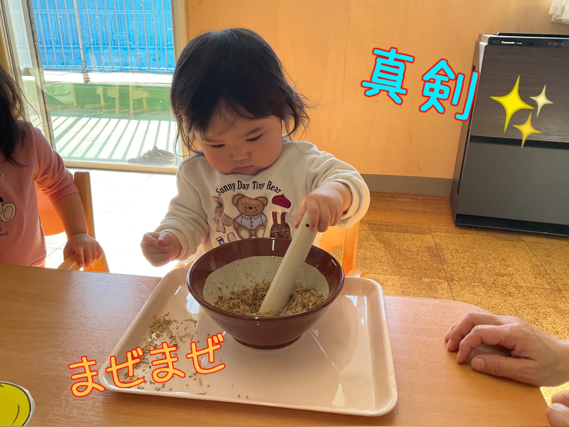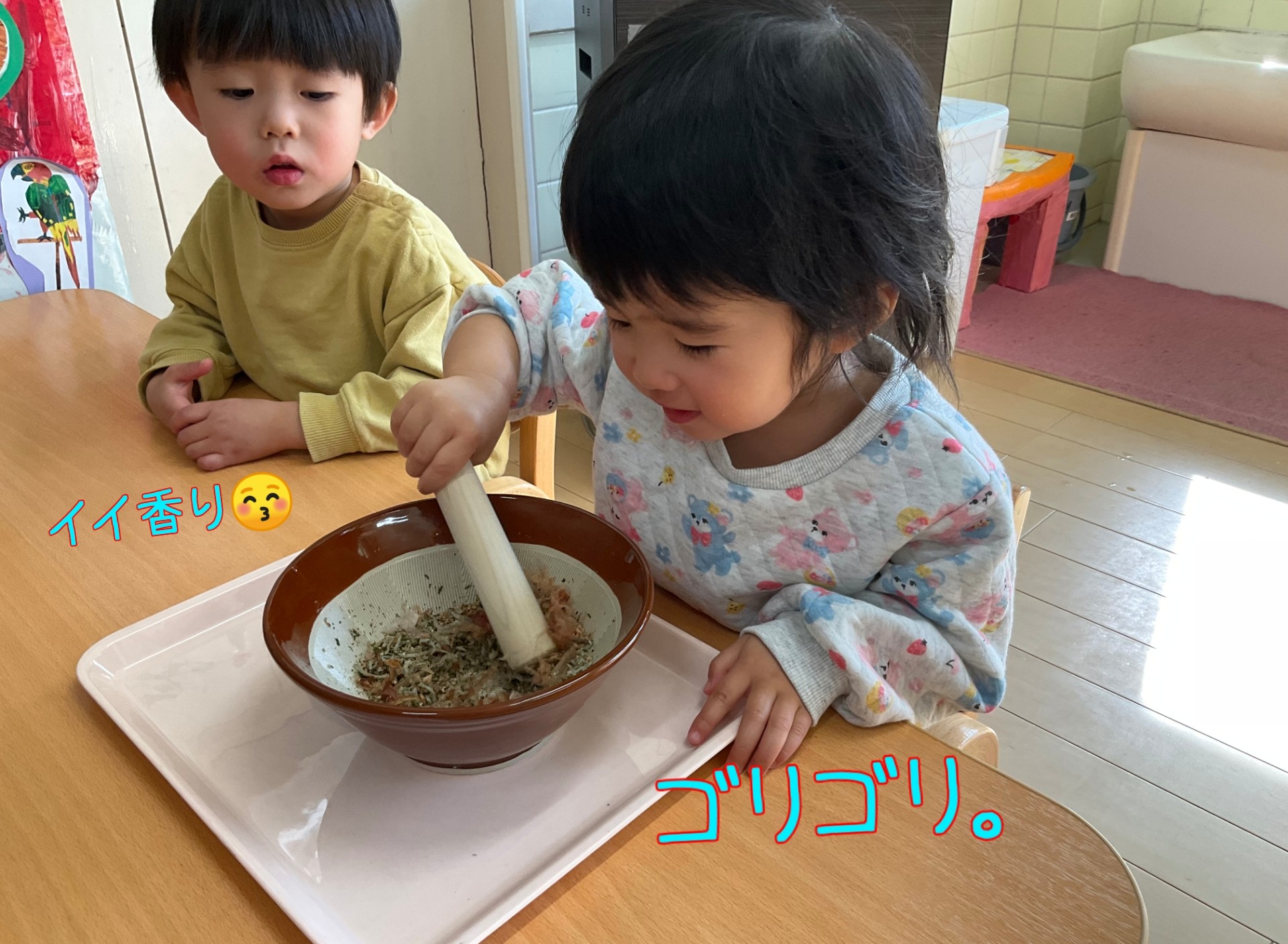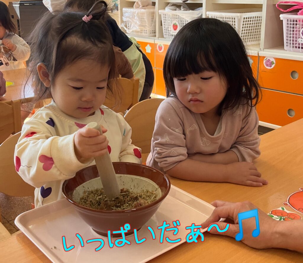 1歳児クラスが、すりばちとすりこぎを使ってふりかけ